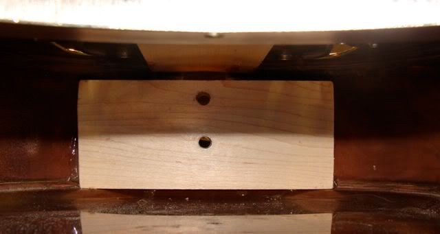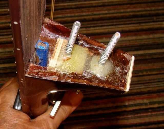 Here are the banjo neck bolts that are epoxied into the neck. Just like installing a bolt on banjo neck. Plus the fingerboard extension is screwed down thru the top into a block of wood glued inside. That's the wood showing thru the top of the neck hole in the photo above.