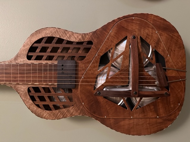 the tricone was built for me by Ben Bonham, with leaving room for the Krivo included in the design...it is myrtle (sort of the mainland version of koa) and rosewood...it has a jack wired into it that is mounted near the endpin.