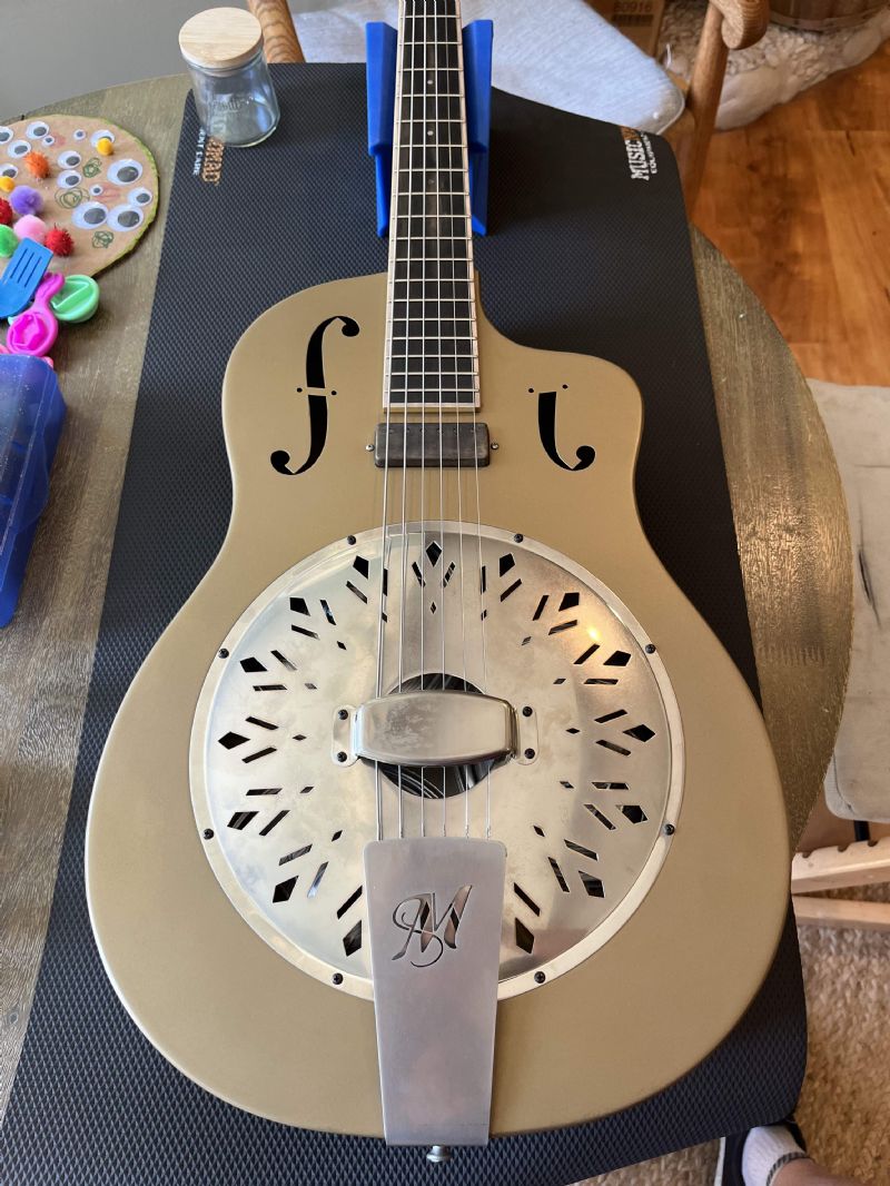 Speaking of, I haven't really tested it out amplified yet. I've plugged it into my Mesa Rosette and it sounded fine, about as good as I expected from a magnetic pickup on a resonator. I bet if I plugged into my Mesa Mark IV I could get some wonderfully nasty growly sounds out of that pickup, but my repertoire doesn't really call for that right now so that's a test for another day.