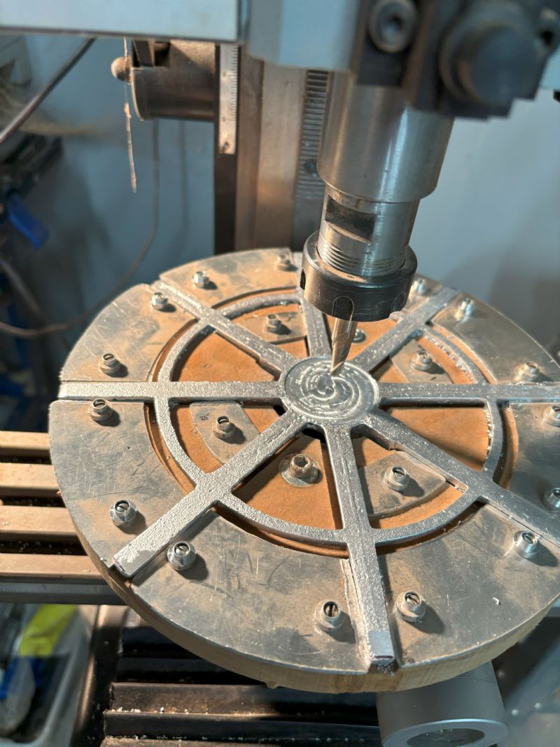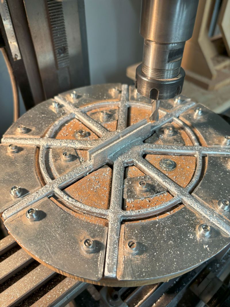 After cleaning up the spider with a file and removing the spue the next step is to mill the underside. Cutting off the spue (that big blob of metal from the pour) leaves a stub that must be removed. Note that different casting methods place the spue at different locations or eliminate it altogether. I do it my way.