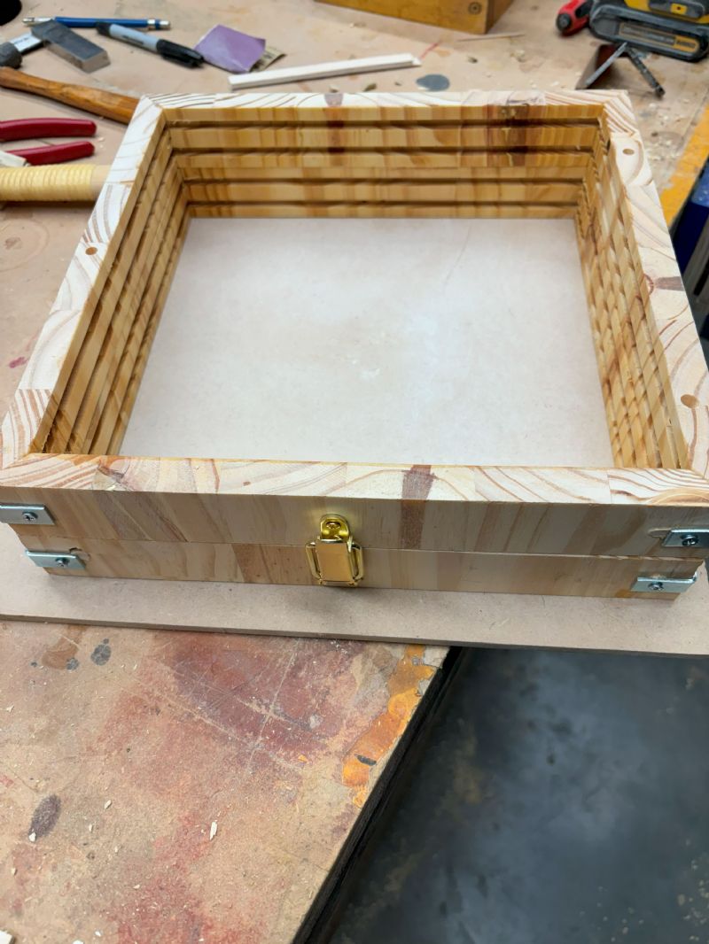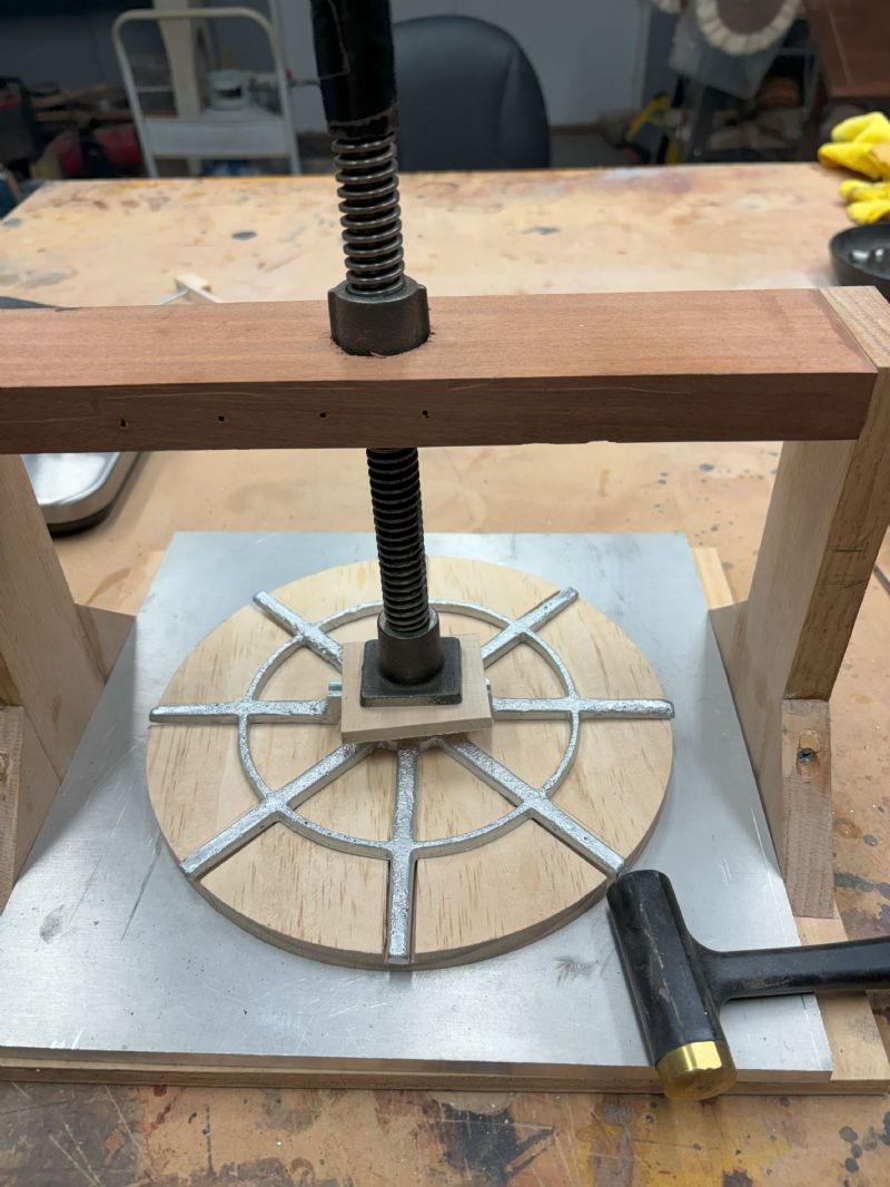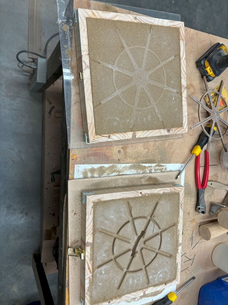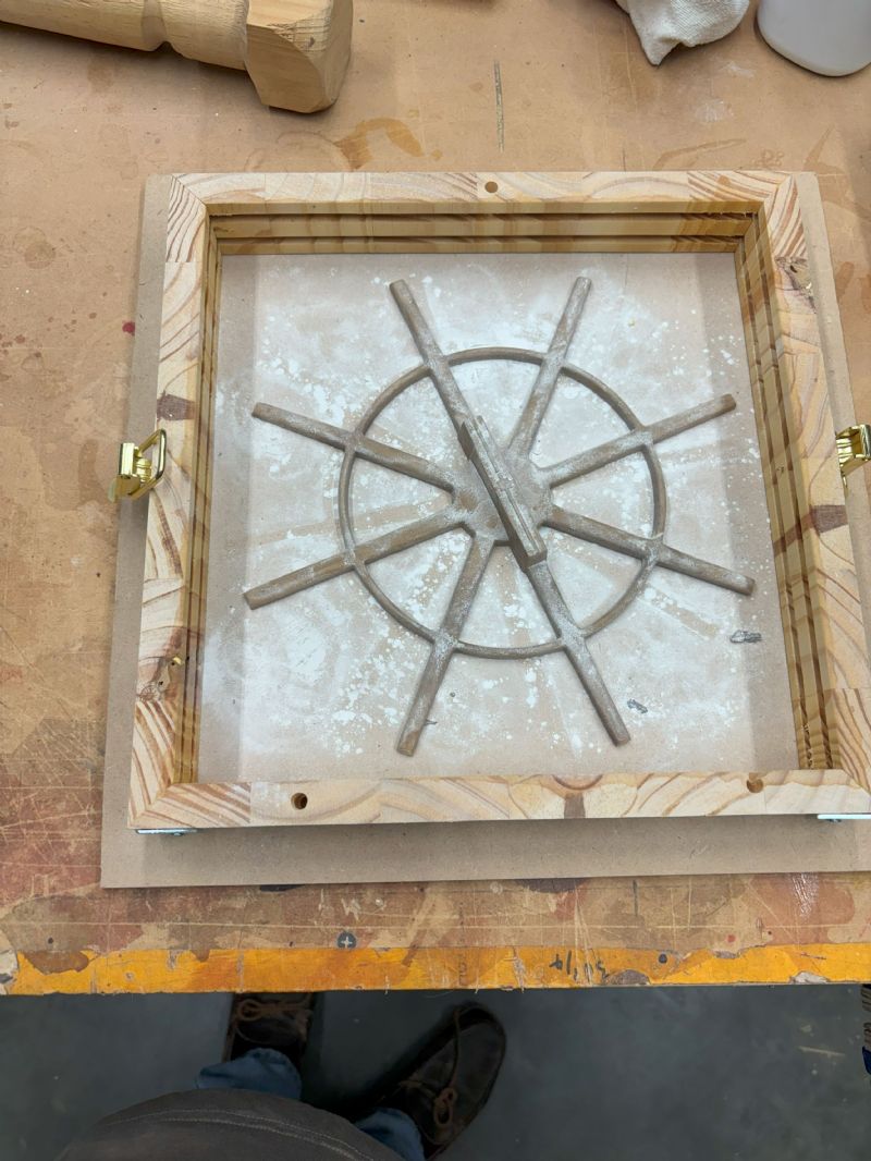 Somehow all my wood flask molds went missing over the years and I had to manufacture a new one. Everything finally done it’s time to load the mold. An eagle eye may notice that I’m using a different spider form than the one I made earlier. I found a box of my old forms and decided to use one of my favorites. The sand is packed around the form and a sprue hole is added.