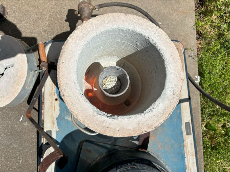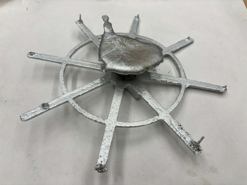 In the past I purchased different aluminum alloys and I still have some of them stored. I found some 2021 aluminum that I apparently never tried and decided to use it. The foundry is fired up and metal melted. I don’t have pics of the actual pour as it is difficult (and dangerous) to pour molten metal and snap pictures at the same time. What is shown is the spider removed from the flask after the pour. Also not shown is a second pour of a test strip... more on that later. For the Metallurgists out there note that I don’t do any sort of tempering, annealing or aging.