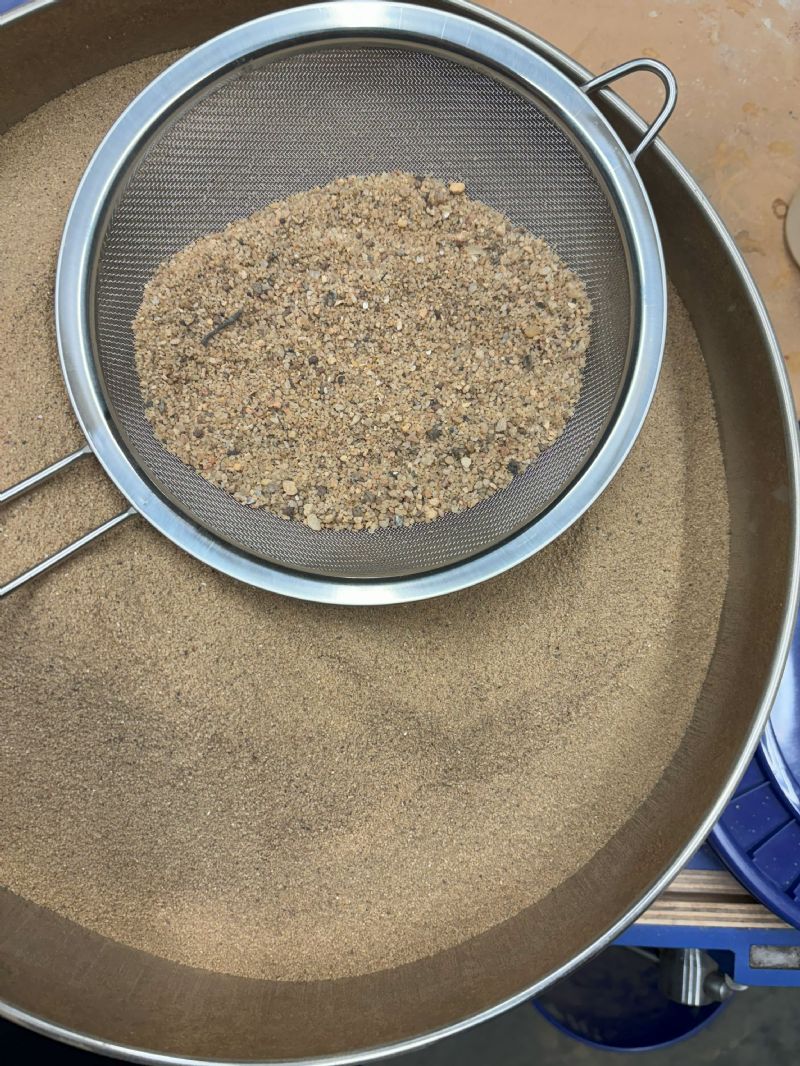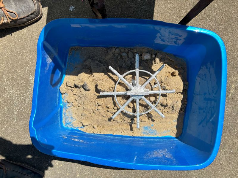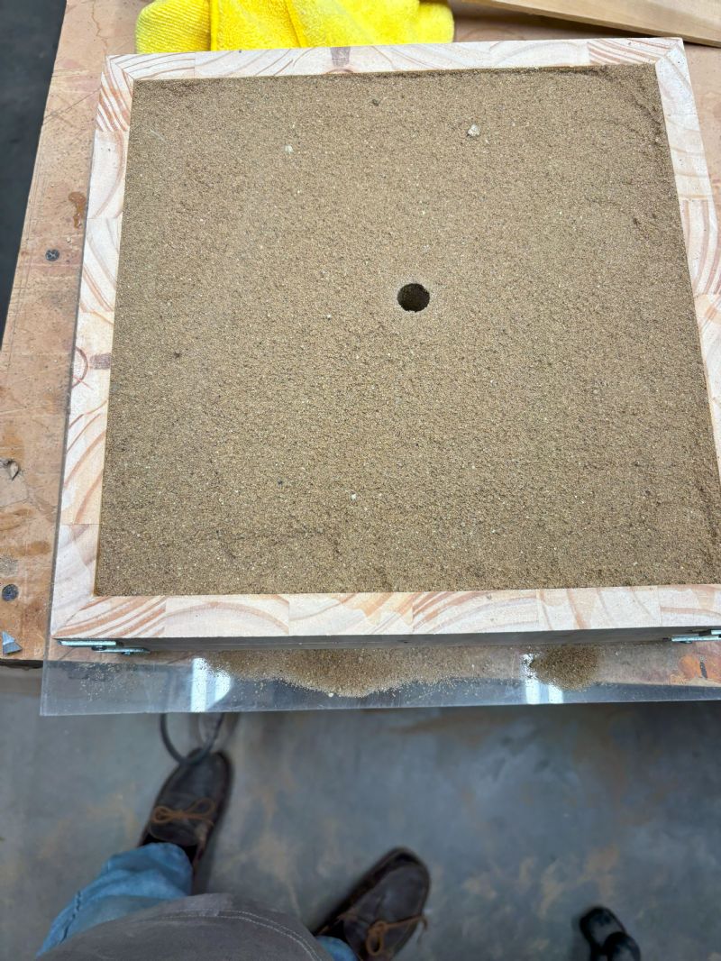 In the past I used a product called “Petrobond” sand in the mold, which does a great job of producing an aesthetically “clean” cast but is quite costly. For this exercise I decided to try “greensand”, which is playground sand mixed with clay and a bit of water. A 50 Lb bag of playground sand needs sifting to remove impurities such as rocks and wood. This yields about 30Lb of usable sand.