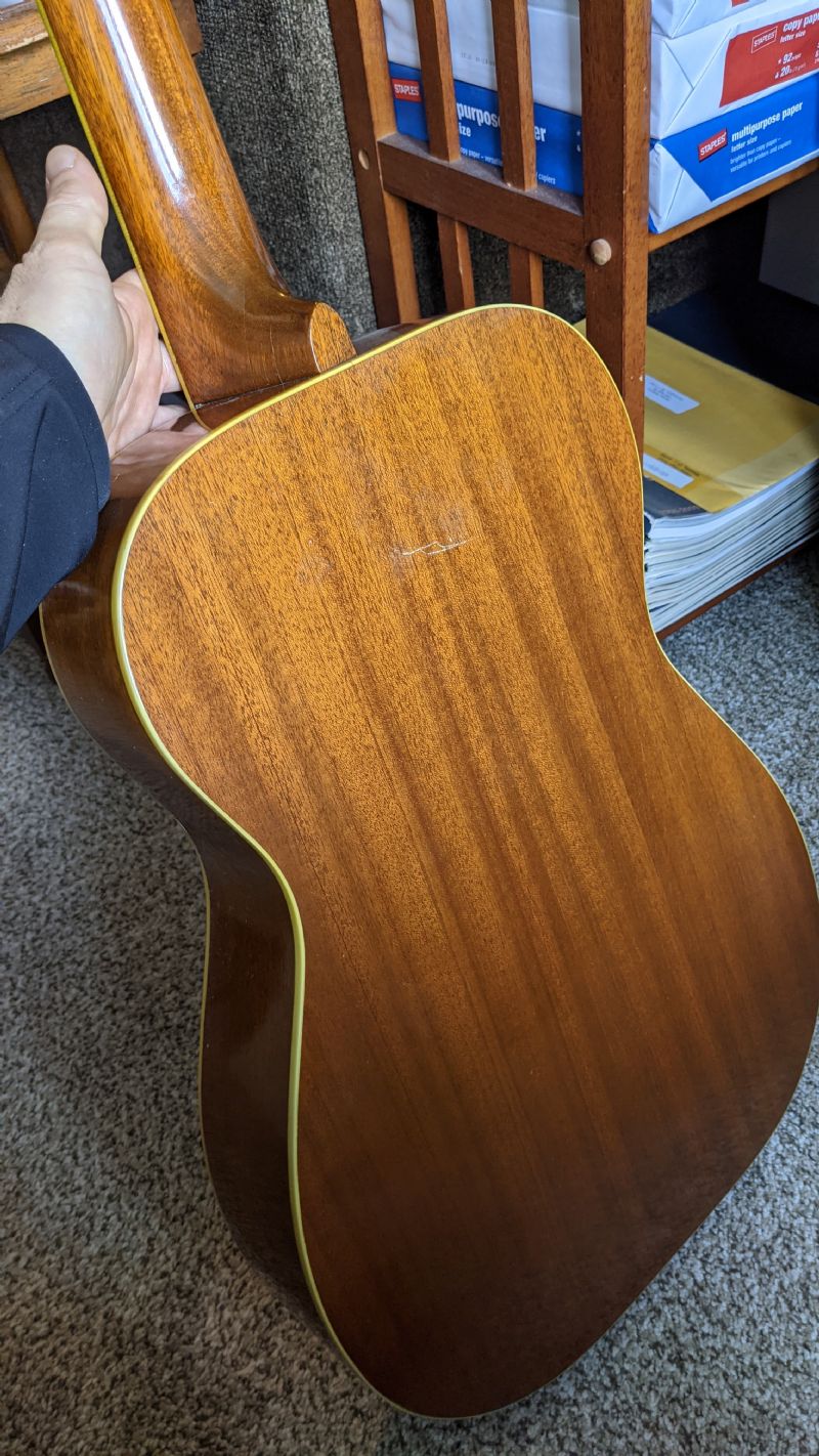 If it was oversprayed, which is applying fresh lacquer, then the body might be an earlier guitar from 1929-30, a Model 55 with this particular finish color. If it were sanded and refinished in a lighter shade, then it could be a 1933 Model 37.