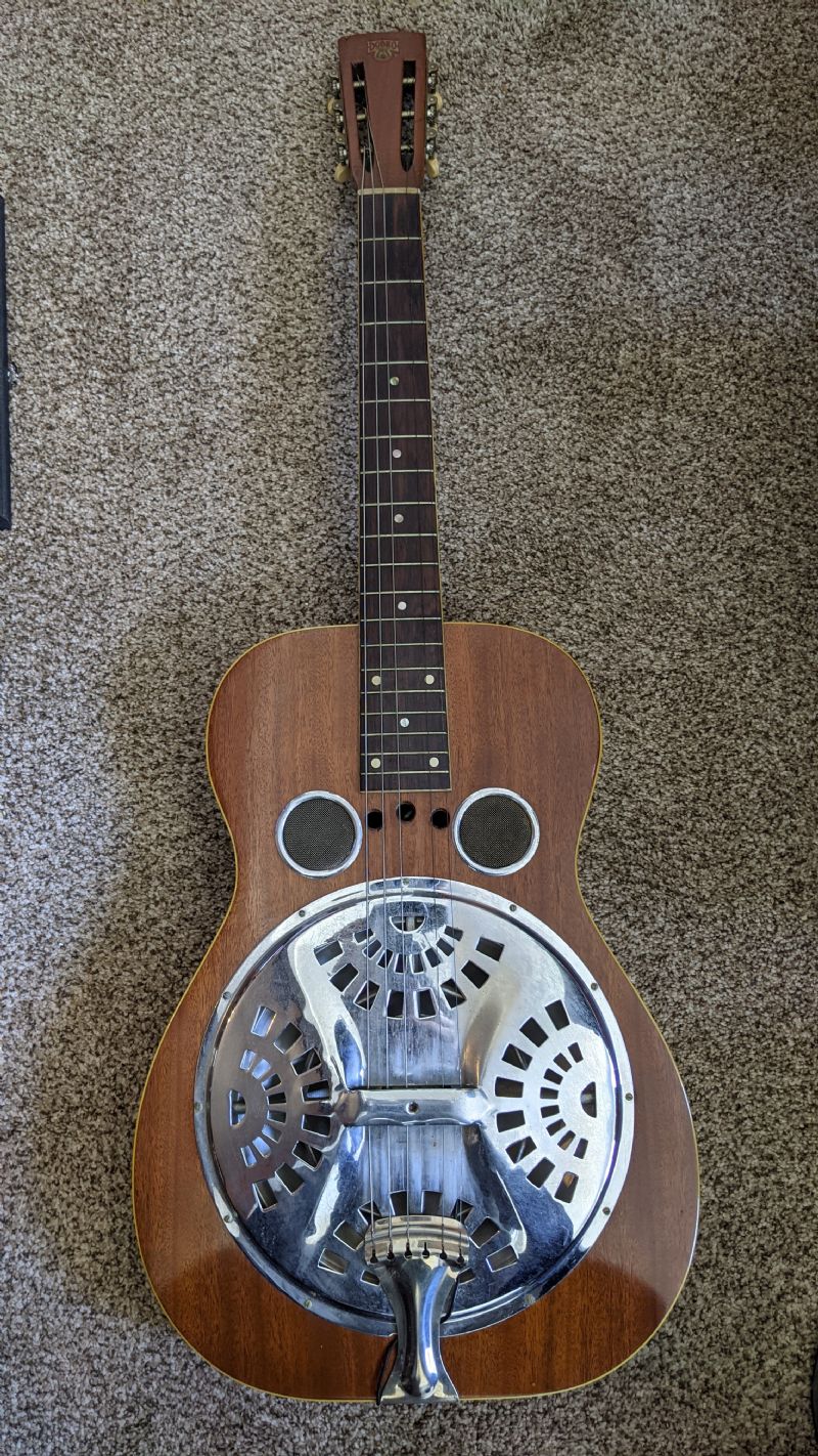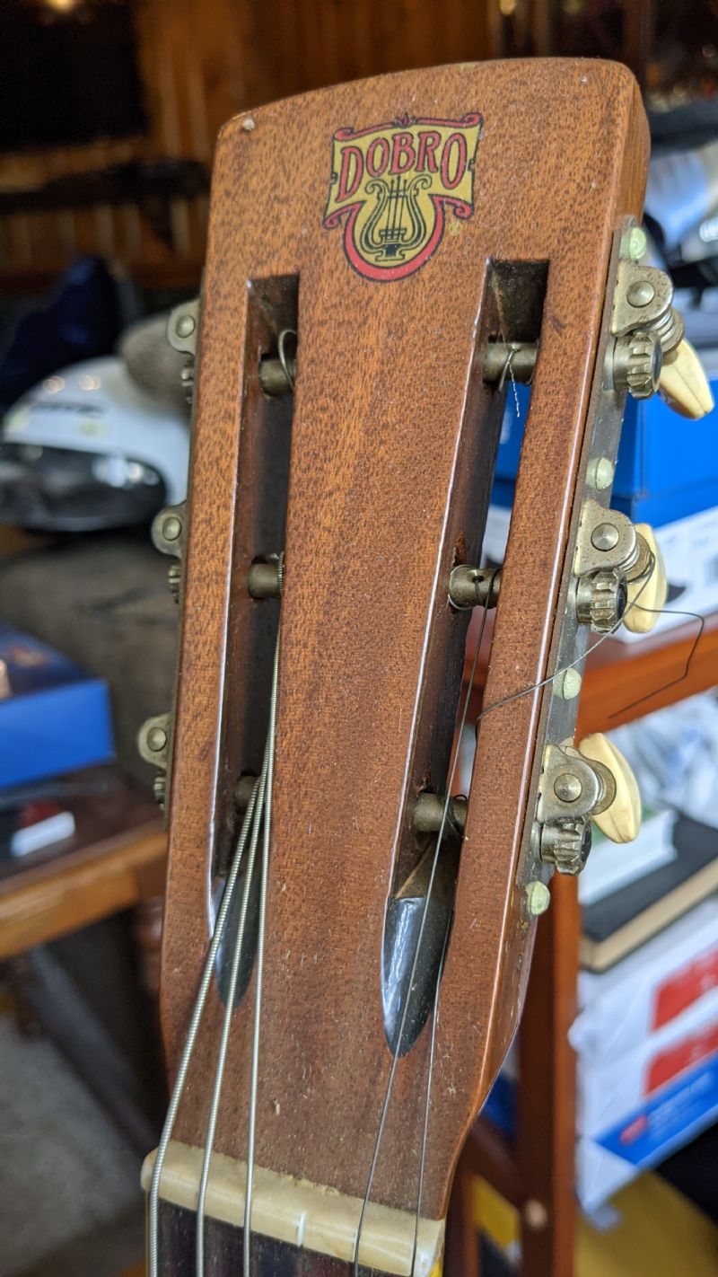 So this is weird: if the body is a Model 55 from an earlier year (in 1929 many Dobros had yet to have a serial number, it was the first year of production), then the neck is from 1933. Definitely a Los Angeles Dobro neck because of the squared off slots on the headstock. Hard to tell from the photo of the coverplate, but it appears to have been modified, it looks like there is no longer a screw at the 12 o'clock position facing the fretboard. All of the early California Dobros had screws at 12 o'clock and 6 o'clock - it was a bad idea, because you had to remove the tailpiece if you wanted to get the coverplate off for maintenance. When Dobro licensed Regal to build Dobros in Chicago around 1933, some smart guy changed the screws to 5 and 7 o'clock at the tail end (and 11 and 1 o'clock on top), so you could remove the coverplate and leave the tailpiece in position.