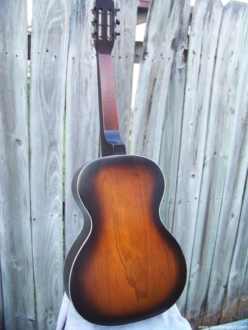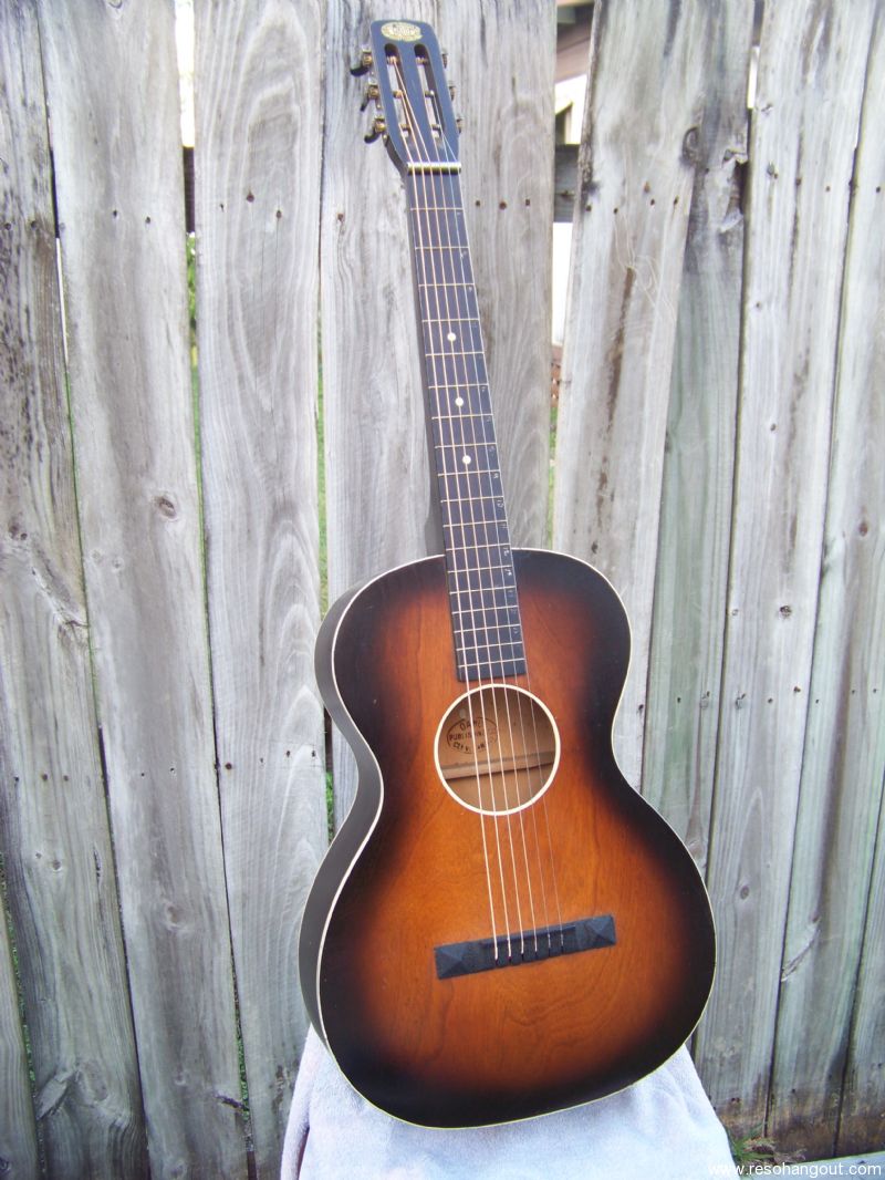 FS-Clean example of a 30's Regal built Oahu slide guitar.All original with square neck.nut raiser,and original Oahu bullet shaped bar.Be hard to find a nicer example and it's ready to play too,with decent volume.A great survivor and good starter instrument at a great price-solid birch with metal bolt on bridge.Sold without case,but packed securely.Thanks
