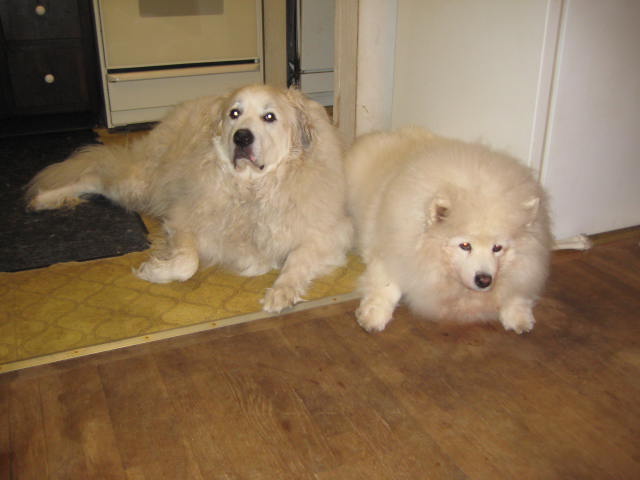 Chief, one of our Great Pyrenees Mountain Dogs, & Maddy, who is our "Mama Samoyed" (the mother of Luna).