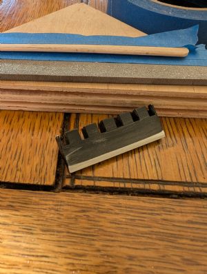 The roller nut was an exact fit on the Beard - no surprise, as Beard and Hipshot teamed up on the design. Both the Apply and 'Horn had a gap below the nut that I filled with one layer of veneer. On the Appy, the nut slot was too narrow and needed to be routed at the peghead. On the 'Horn, the thickness of the roller nut was just larger than the nut slot; I filed a bevel onto the outside bottom edge of the nut (using a popsicle stick as a shim to create the bevel) to prevent modifying the 'Horn - a little Steinway Touch-Up Kit (a.k.a. black Sharpie) on the filed end and good to go.